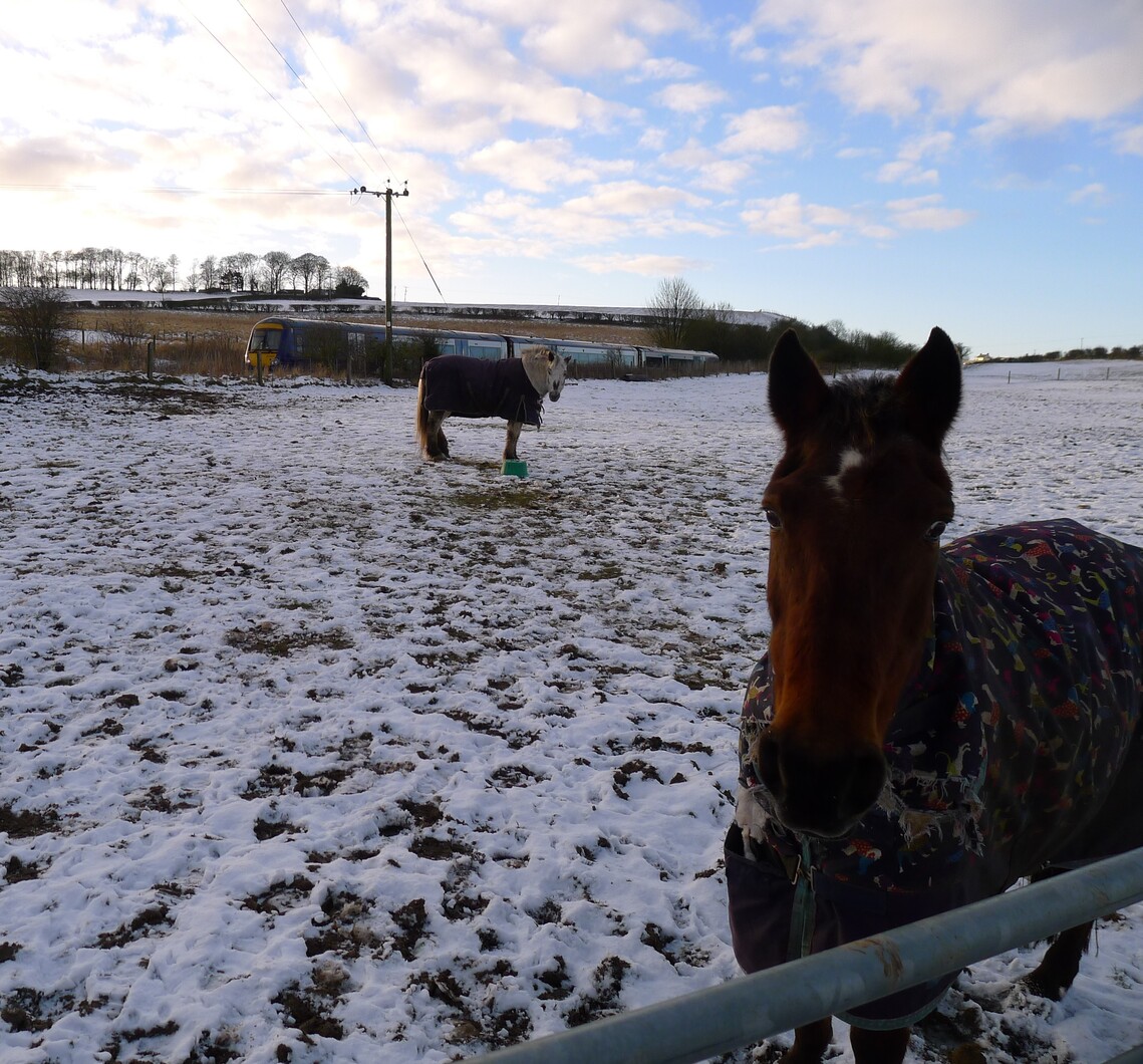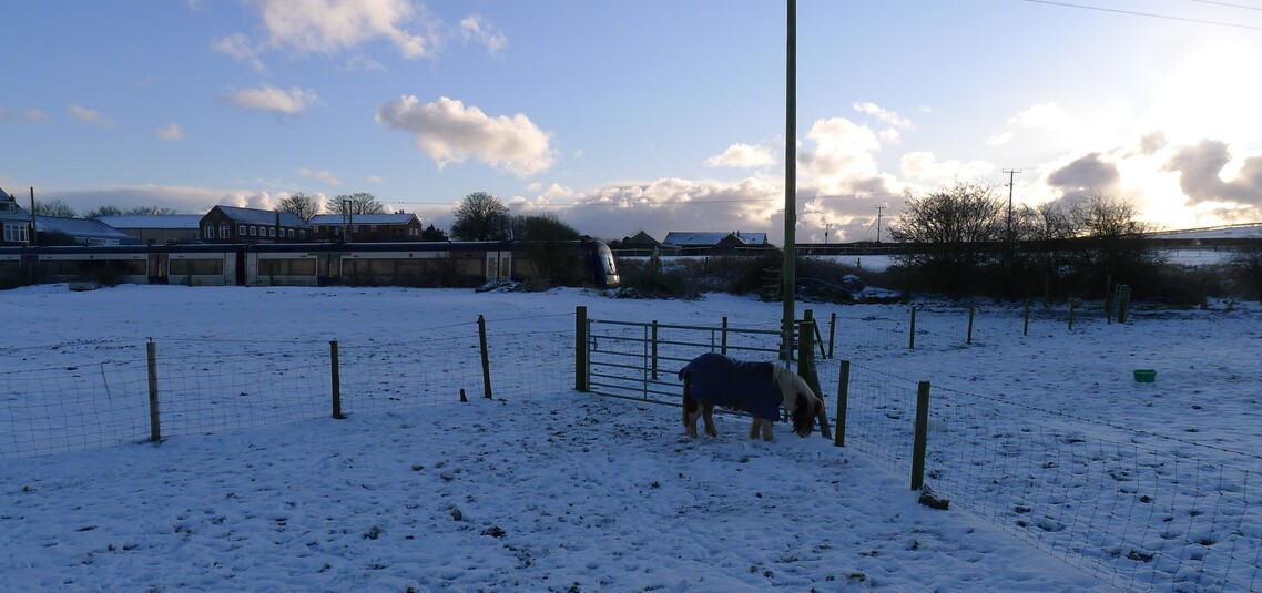 Photo above: winter's dawn February 2021, with little horse in the snow and Turbo Star train en route to Hull