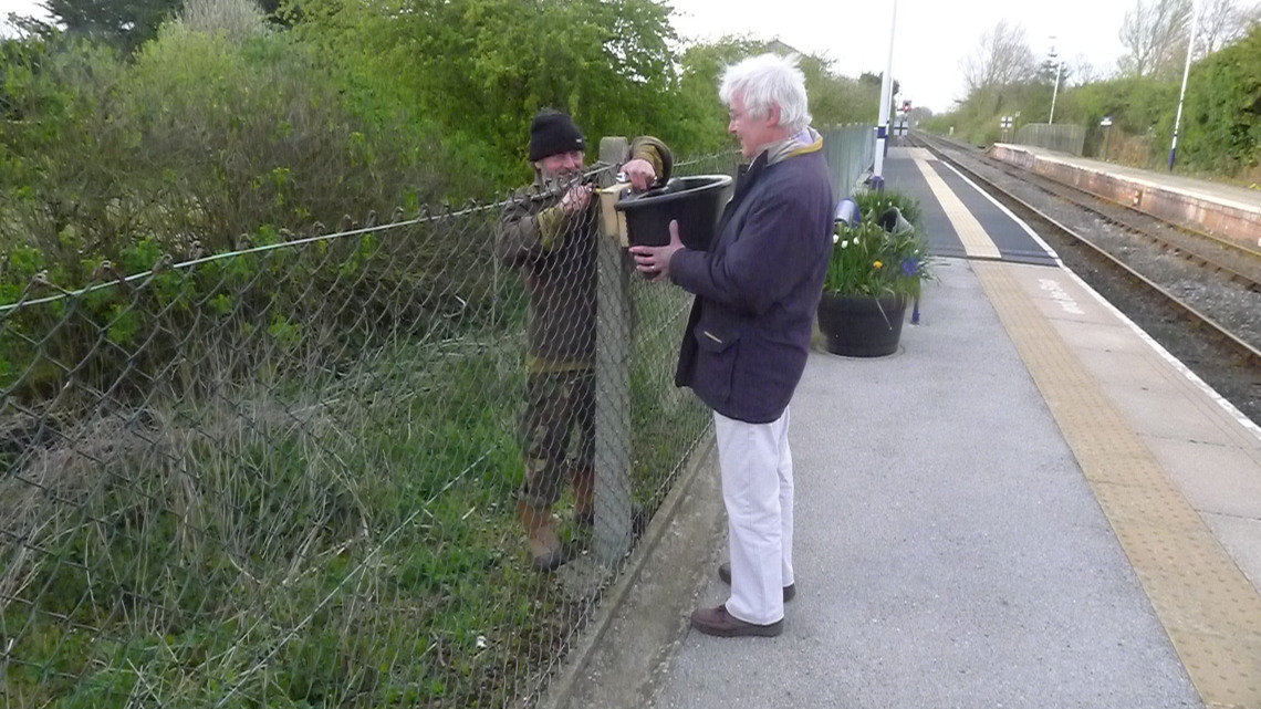 Below, Geoff and John install the 6 half-moon planters to which will add a bit of colour to platform 2.