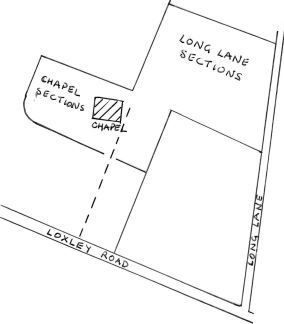 Loxley Cemetery is divided into two main areas: the old sections around the chapel, and the newer section off Long Lane. These main sections are then sub-divided and the layout is quite complicated. These pages should help you understand the different sections and the layout of rows and plots within them.
