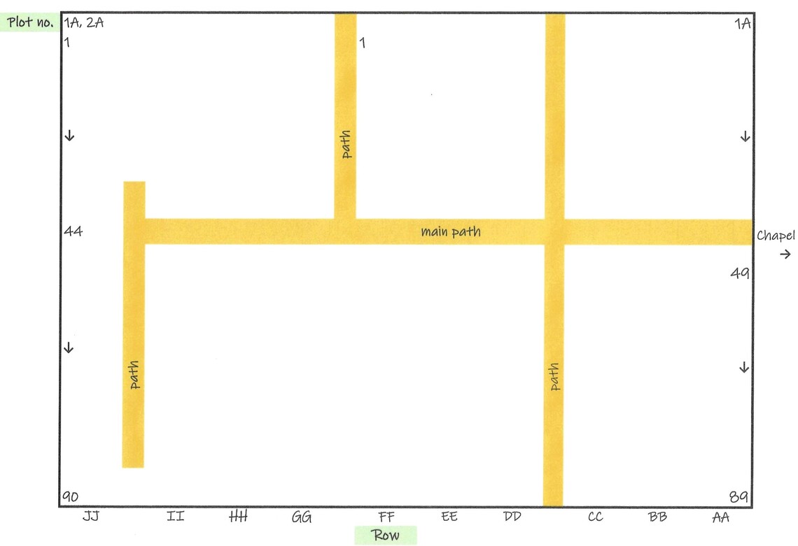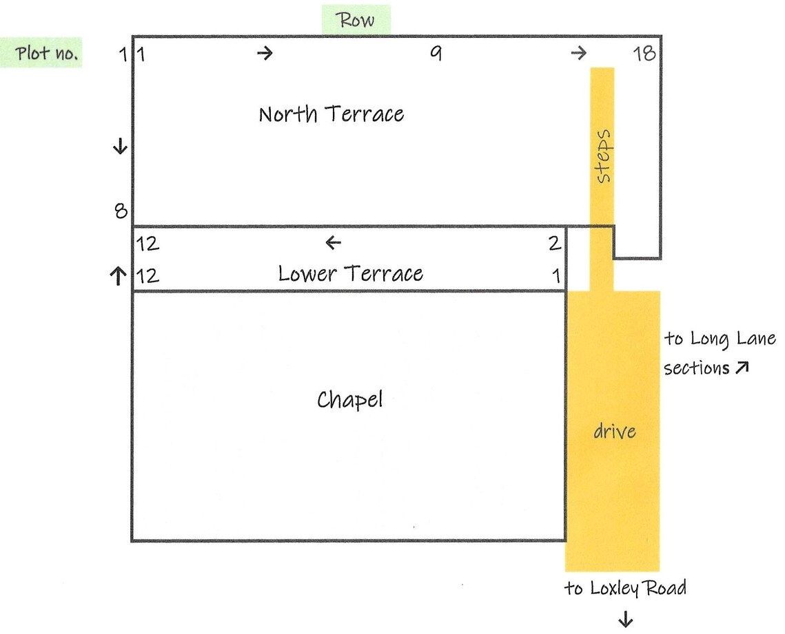 The numbering of the rows starts at the south (bottom end) and goes from 1-17 (west to east) across and 1-34 (south to north) up from the bottom boundary of the chapel land. Both rows and plots are numbered so the plot references look like this: CSS 6 13. Some of the Flood victims are buried here.