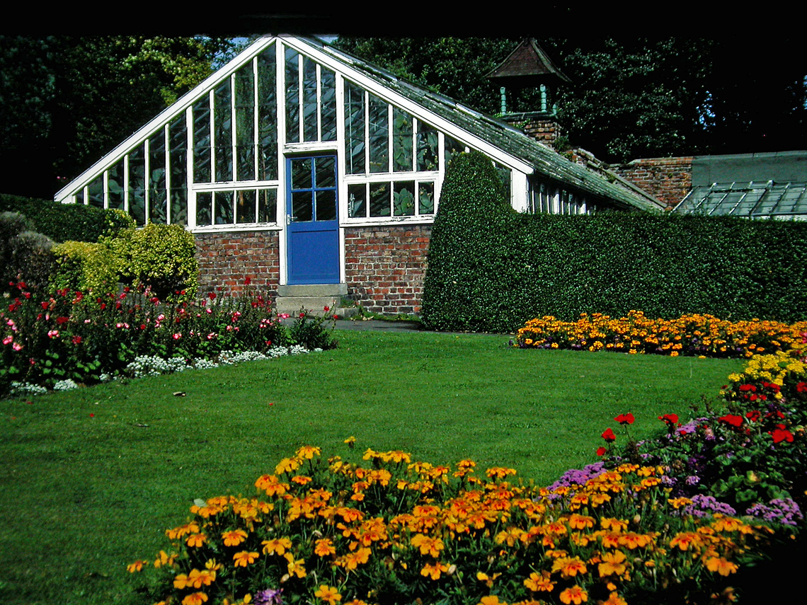There are three aviaries shown, a large one on the flower bed below the site of the bandstand and two smaller ones on the main drive next to the greenhouse and one against the wall (the remains of which can still be seen) in front of the gardeners' cabin. The gardeners' cabin and the two large greenhouses were built in 1862 by Mr Thomas William Carr, who previously maintained gardens, and a croquet lawn in the dene before the creation of the park.
