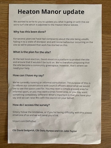 2020 – Stockport MBC Councillors Sedgewick, Taylor and Reyness send out a survey requesting public opinion on a future use for the abandoned astroturf site.