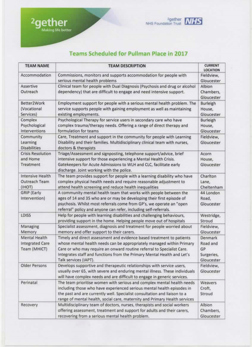 2gether NHS Foundation Trust - Making Life better. 'We provide specialist mental health and learning disability services to the people of Gloucestershire and Herefordshire. We’re an innovative and forward-thinking organisation, with a real commitment to providing a high quality service. We were also the first trust in the country to be awarded an ‘outstanding’ rating for acute inpatient services, crisis services and psychiatric intensive care services'. 'Select a condition' facility, Help in a Crisis, Read about the new Gloucester Hub, etc.... List of Teams scheduled for Pullman Place latter this year.