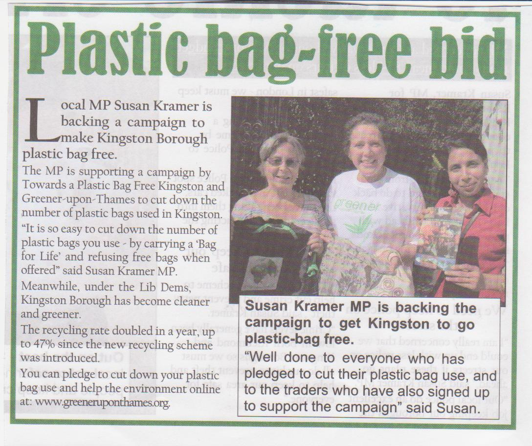 Nothing much else changed, and the name change simply reflected the fact that we had joined forces with our neighbours in the borough of Richmond, in the umbrella group Greener-Upon-Thames, which shared our aims. The new name also reflects our origins in wider concerns about local waste and recycling, and will allow us to continue with other environmental campaigns when there are no more plastic bags to worry about. See http://www.e-voice.org.uk/greenerkingston/news/why-have-we-changed-our-name/.