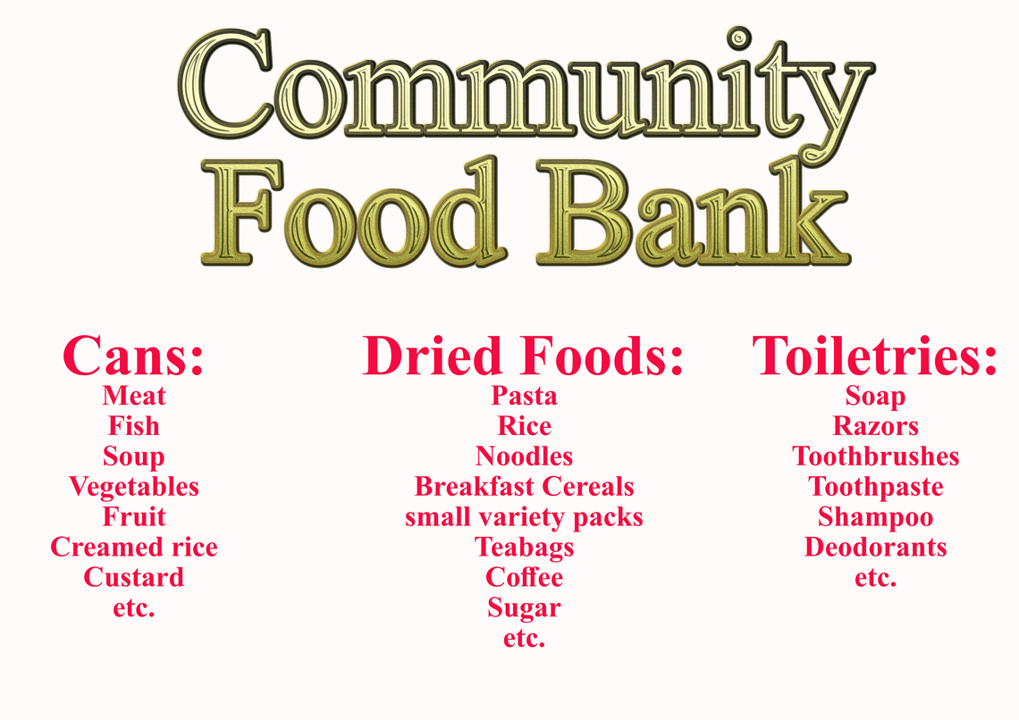 The Food Bank is in church at the end of the North Aisle by the Mothers' Union notice board.