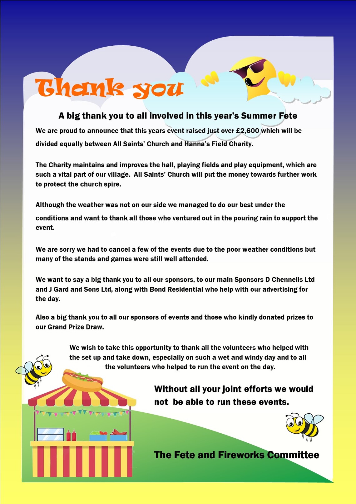 This year the Fete made a profit of £2,600 which has been shared between Hanna's Field Charity and All Saints' Church. The reduction in profit against the previous year was put down to the rainy weather preventing people from attending, but those who came had a good time. There is an album of pictures under Photos.
