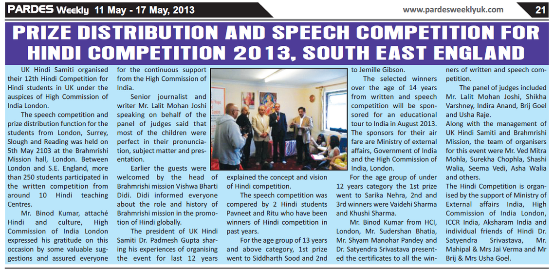 PRIZE DISTRIBUTION AND SPEECH COMPETITION FOR HINDI COMPETITION 2013, SOUTH EAST ENGLAND