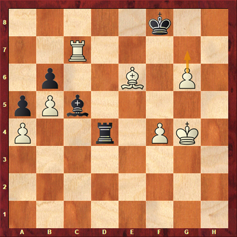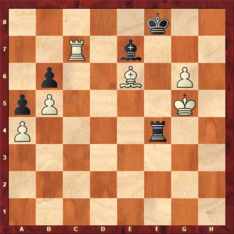 … Be7 check! White cannot play Kh5 or Kh6 because of Rh4 mate. He should have played R x e7 when after the major pieces come off, the white pawn can be forced through in the king and pawn ending. Instead White chose K x f4, and after Bd6 check, Kg5 B x c7 , Kh6 Be5 the game was agreed drawn.