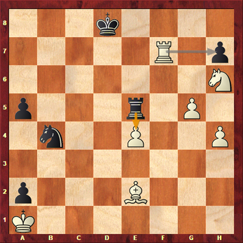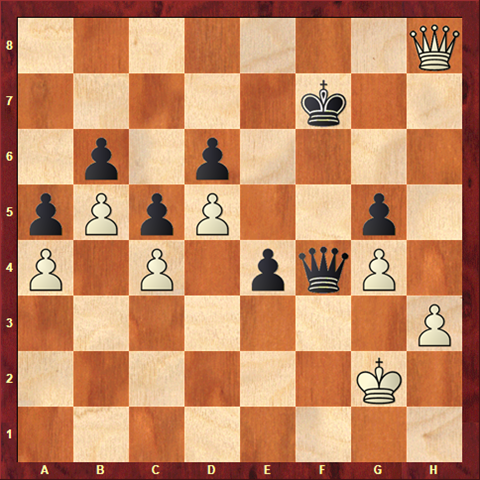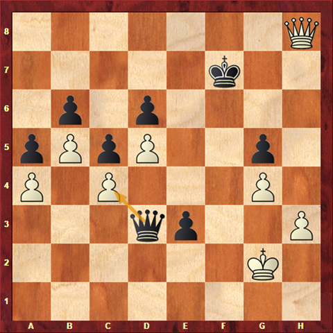 The draw can still be forced, but the pawn push has changed the position. White failed to pause and consider how this small move might change things and continued with his original drawing plan. Qh7??? As well as not taking sufficient care this also illustrates another chess axiom that backwards captures are hard to spot. Black’s queen was almost out of sight.