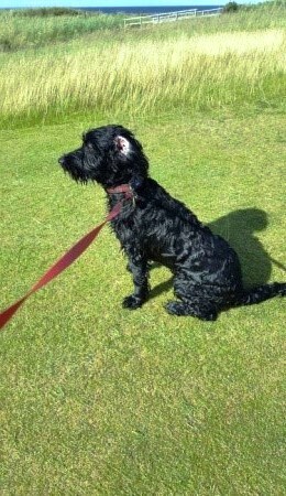 You will have gathered over the weeks that Doddie is an adventurer, an adrenaline junkie, a thrill seeker. The antics that Doddie gets up to must raise my blood pressure and they can certainly elevate my stress levels. A few examples of this week’s activities include the following:-we were walking on a well-known golf course that is at present closed for golf, when he discovers the ‘Burn’ which is channelled into deep stone clad troughs. Surely not, thinks I, it is too narrow and deep, but no, true to form despite my shouts of ‘NO’ his Lemming qualities kick in, and in he plops, water right over his head. It is too steep for him to get out alone so I have to get on hands and knees and haul him out by the scruff of the neck. It must have given him a scare, but he was all for having another go – back on the lead! Another walk took us along the beach from Ardross to Elie. Having anxiously steered him away from rocks that he was going to leap from to say ‘hello’ to another dog, imagine my consternation when his head goes up, interesting smell, and through a hole in the farmers fence he squirms, to a field full of cow pats which he then proceeds to toss in the air. Now no dog should be allowed in fields where livestock may be so you can imagine my frantic calls (stress levels up again), but the only thing that works, is for me to run in the opposite direction and call cheerily ‘bye’ (when all I want to do is strangle him)- back on the lead! Just yesterday we were on yet another walk when I turned to see him tight rope walking along the top of a ‘dyke’ which he then falls off, on to the other side, which is too steep for him to get back over. So once again I have to reach over and haul him back by the scruff of his neck – back on the lead!