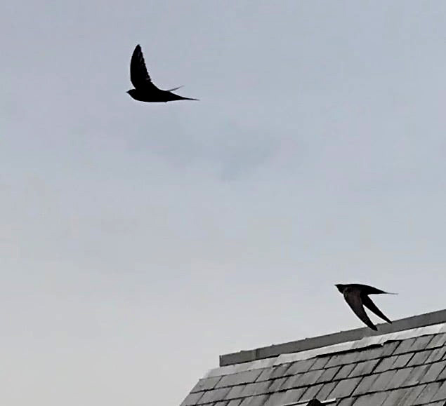 Photograph of two Swifts flying from one of the nests at the rear of the High Street