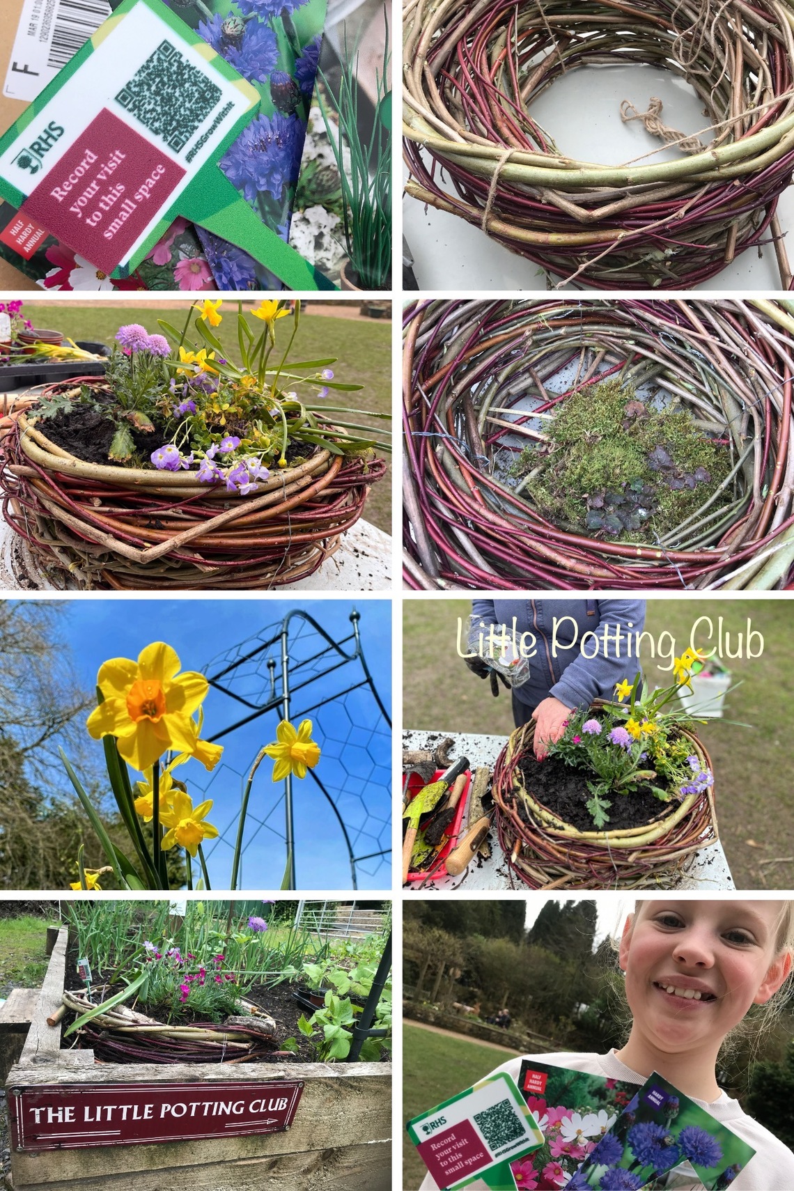 One of our families had a lovely idea of creating a willow planter basket with our left over willow rods. This came at a time when the club enroled for the RHS Growing in Small Spaces project. We created two of these and planted them up with spring and summer flowering plants.