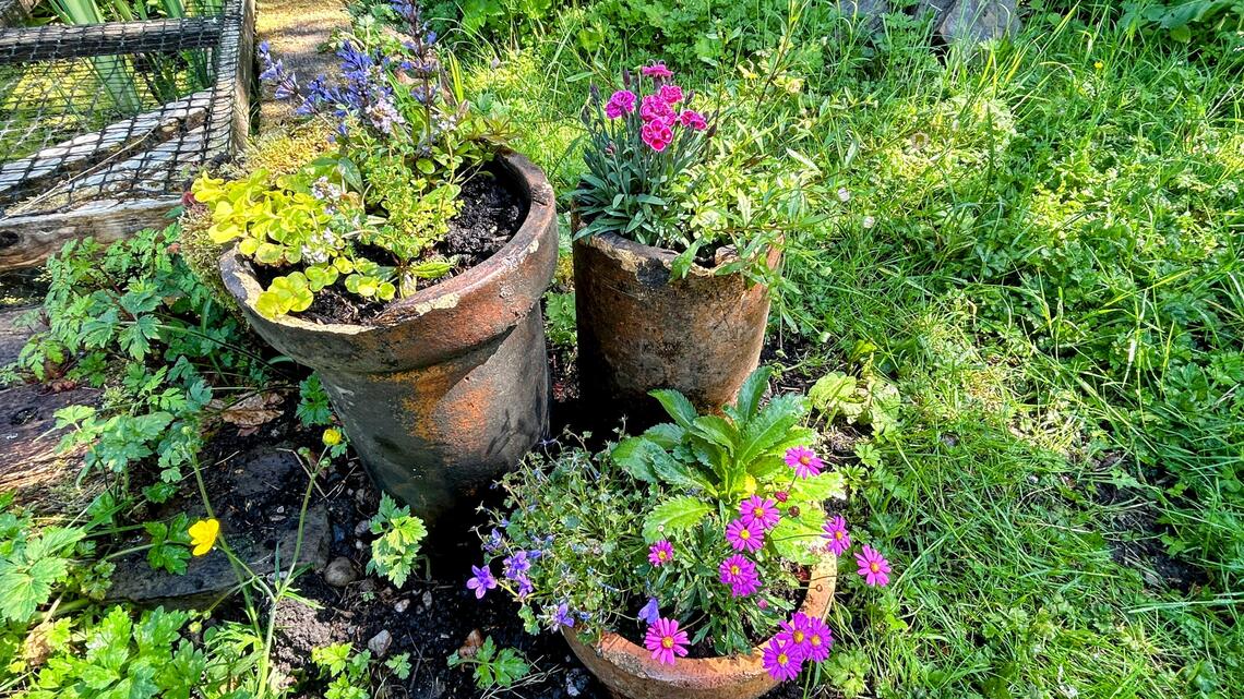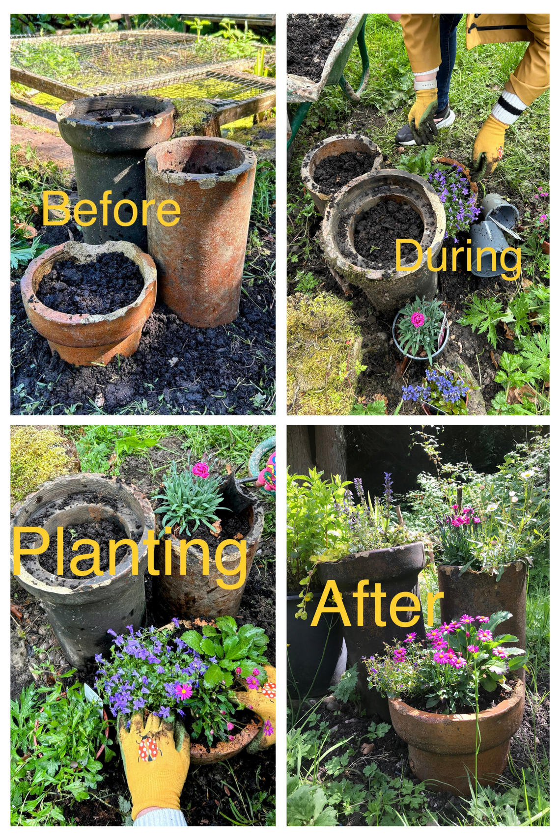 Here we discovered victorian water pipes that had been thrown up from the parks disused underground network. They lay littering the water course and so we reused them in the garden. The club created an access tunnel from their wildlife pond for amphibians and small mammals to access the pond under cover. We planted these three up with flowers for a pond side display.