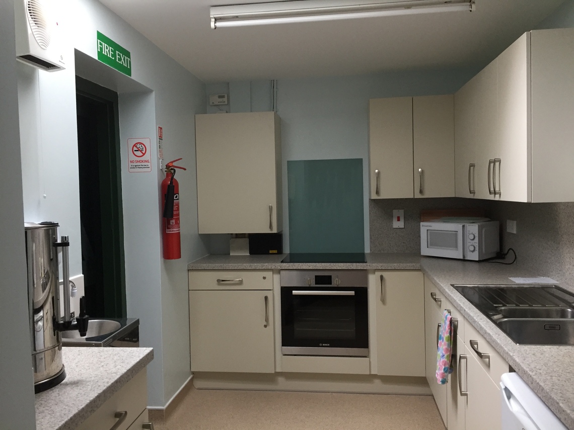 The kitchen has a cooker, microwave, sink, hand-hand wash basin, fridge, tea urn, kettle, and a selection of crockery and cutlery.