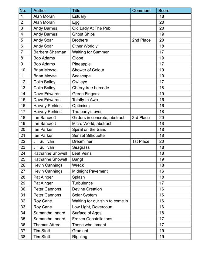 All the competition entries and the Abstract/Minimalist Scoresheetare now published.