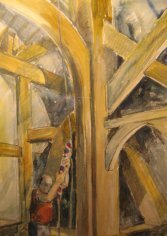 A copy of a painting of a bell ringer in the timber tower. Diagram of a ringing bell