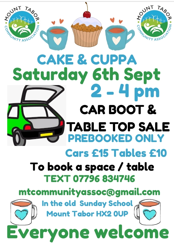 Join us for our monthly Cake, Cuppa and Catch up, this month featuring a tabletop sale and car boot. Email or text us to book your space!