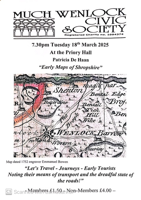 Just a note to say that we are looking forward to being with you again on the 18th for the second of my Early Maps of Shropshire talks. This one has the sub-title of "Let's travel..". How the time has flown!