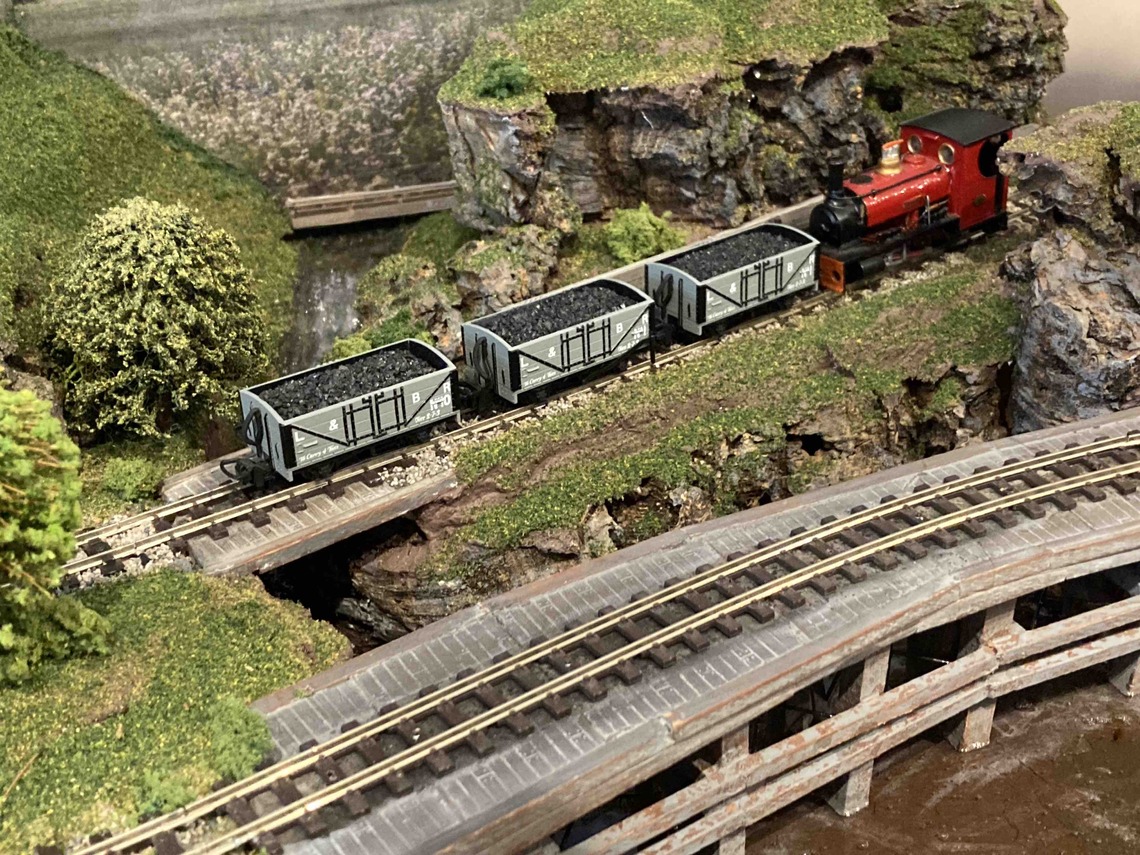John Wilkes wanted to build a bridge; as big a bridge as possible on a 900mm x 400mm board. He turned the baseboard upside down and cut away the apron to create a valley for the bridge to go over – the baseboard required strengthening after this surgery. The valley is steep-sided and rocky, carved from expanded polystyrene, and there is a mine with its own small railway system, with basic track and single-blade points. The mainline sliced the mine system in two, hence a a new way of dumping the mine’s waste had to be found.