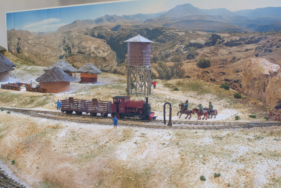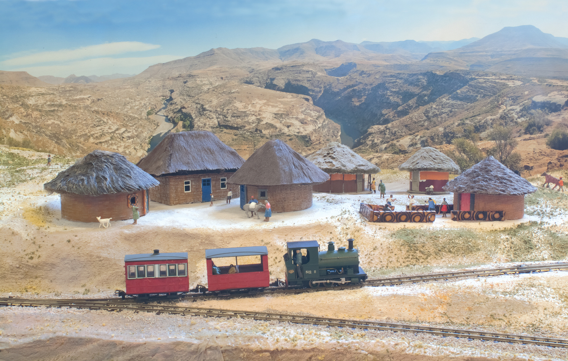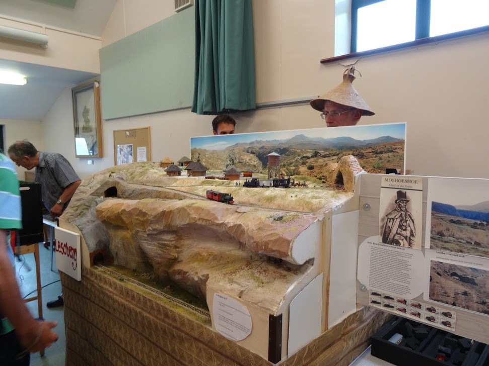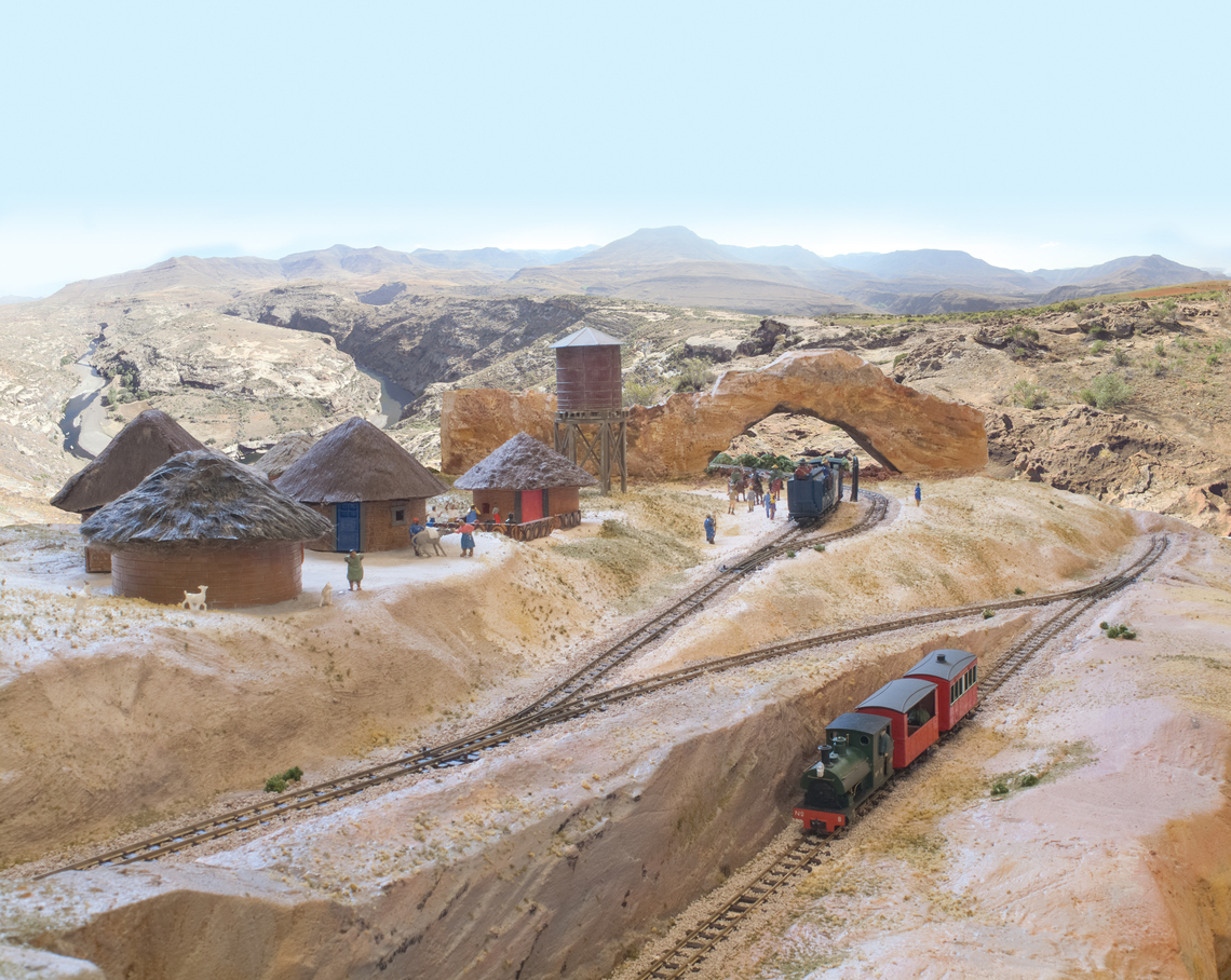 The layout itself is 5ft by 3ft. The lower section is in an oval, with three hidden loops. The upper branch runs from one cassette up the reversing loops, and under the rock arch to another cassette. Operators must wear the genuine Lesotho hat:
