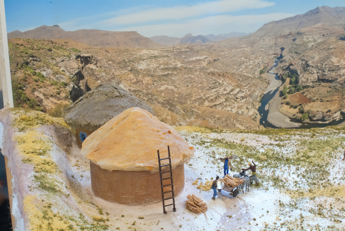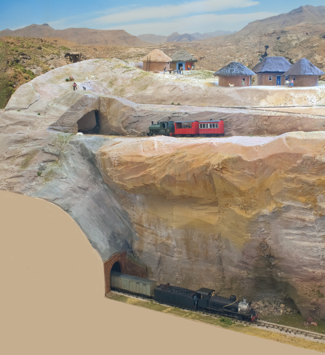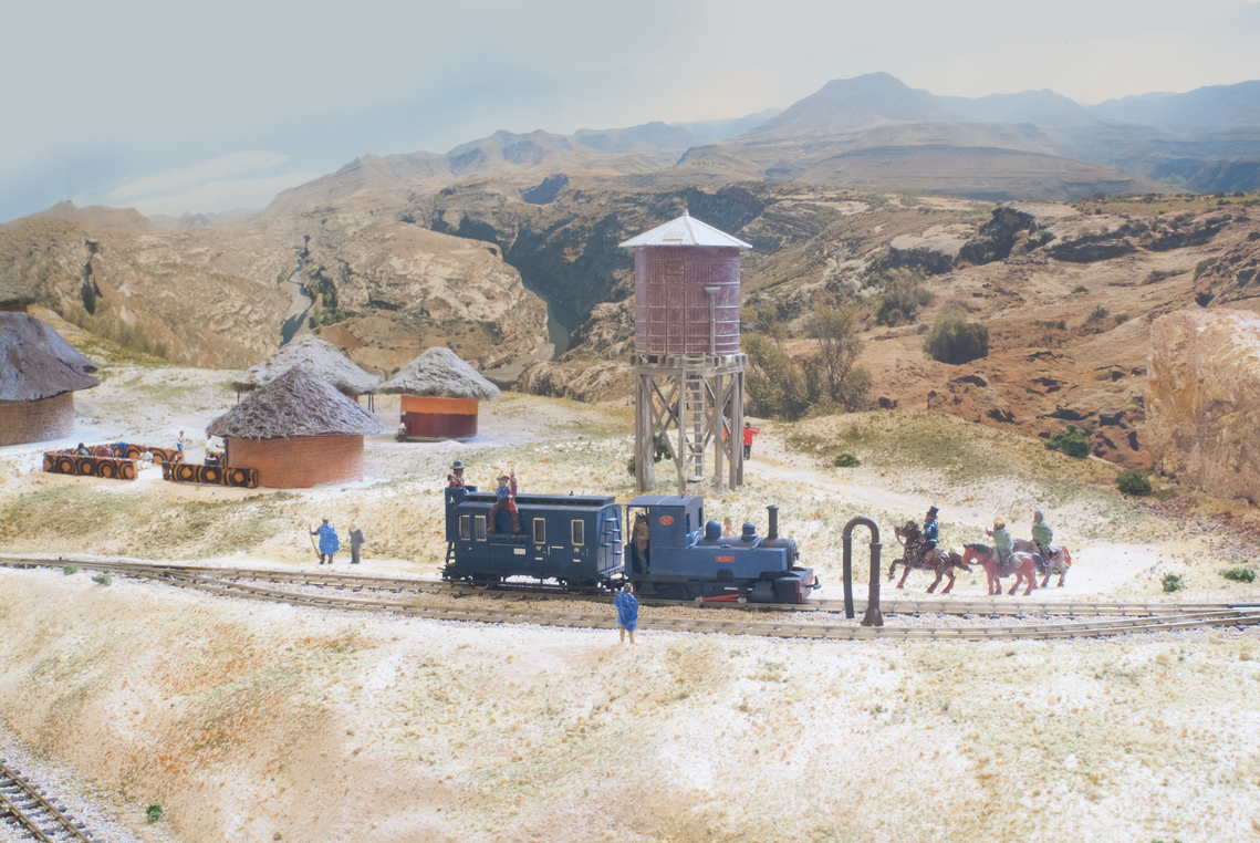 The layout itself is 5ft by 3ft. The lower section is in an oval, with three hidden loops. The upper branch runs from one cassette up the reversing loops, and under the rock arch to another cassette. Operators must wear the genuine Lesotho hat: