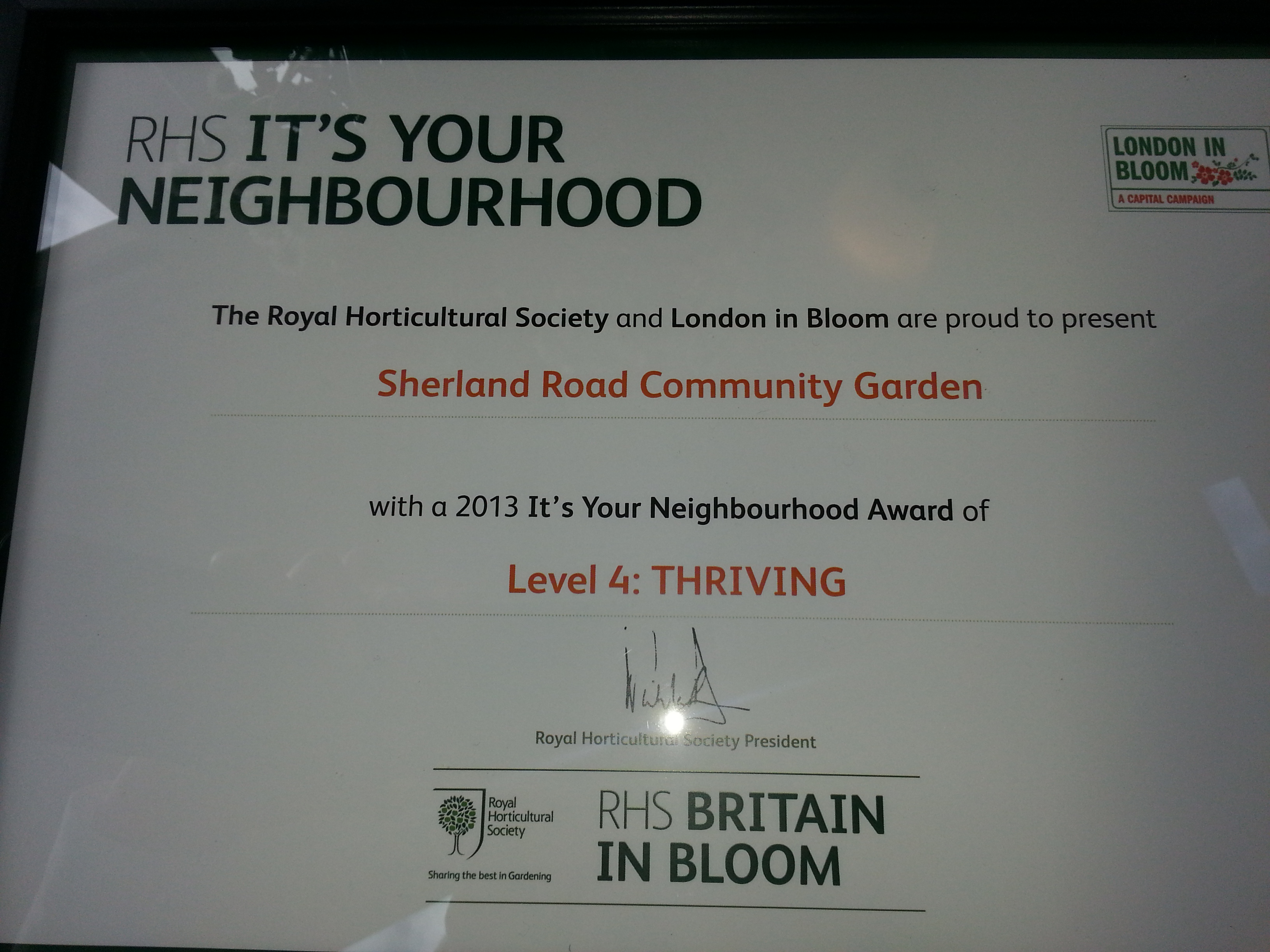 As part of London in Bloom, the Royal Horticultural Society ran an "It's Your Neighbourhood" competition. Every garden that was entered was ranked from Level 1 - 5. The Certificates were presented at Pembroke Lodge on Wednesday 18th September. Our garden was awarded Level 4: Thriving and was only 3 marks away from Outstanding. Something to strive for next year....?