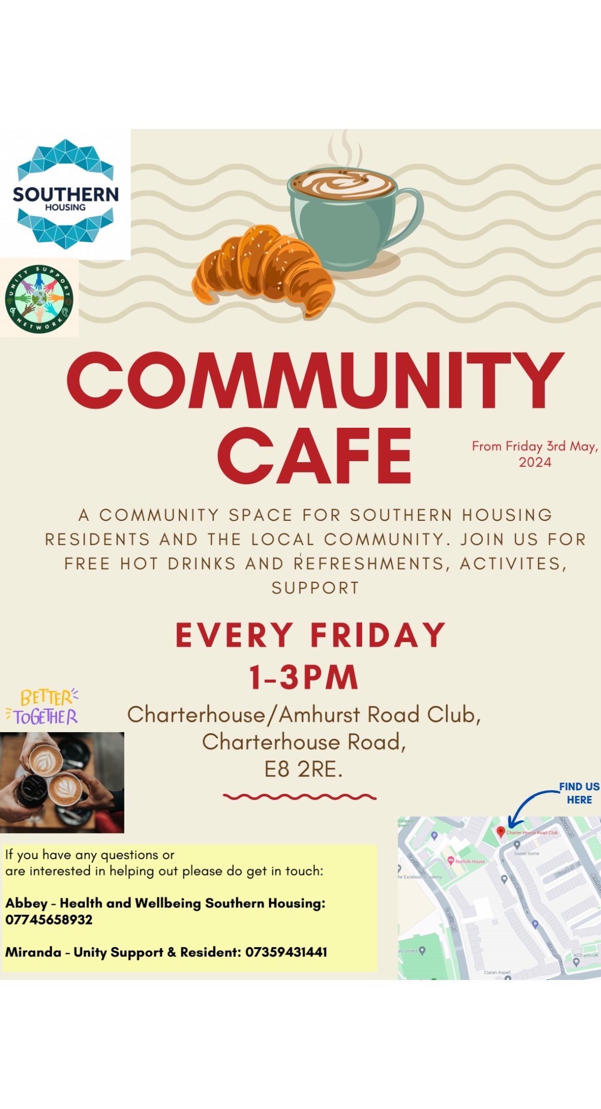 We are excited to invite you to our Community Cafe, a vibrant space for Southern Housing residents and the local community of Charterhouse Road. Come along every Friday from 1 PM to 3 PM at the Charterhouse Road/Amhurst Road Community Centre to enjoy free refreshments, socialise with neighbours, and engage in meaningful discussions about future community events.
