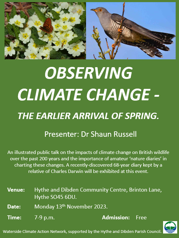 Shaun's talk will illustrate how our changing climate is affecting the lives of the plants and animals with whom we share our planet. Shaun will bring along a recently-discovered nature diary that turns out to have been written by a relative of Charles Darwin. This unique record covers almost three-quarters of the past century, during which the ‘earlier arrival of Spring’ has become increasingly more apparent to us.