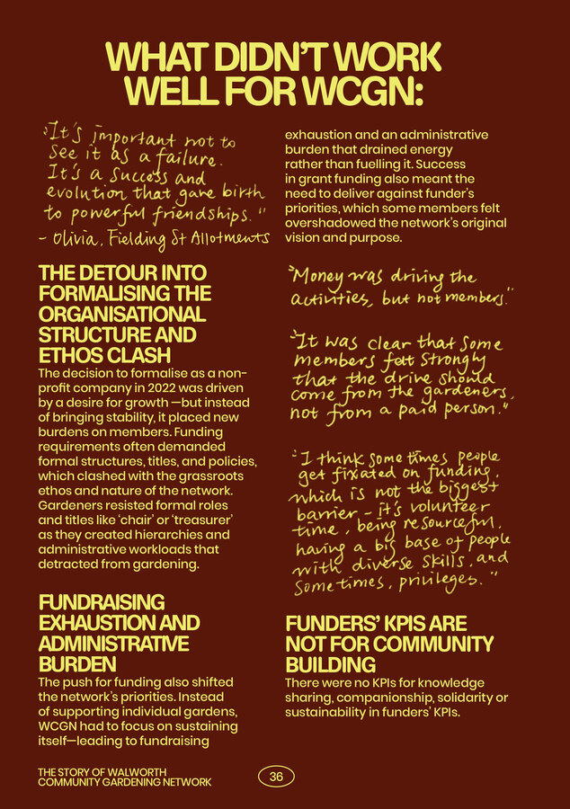 This helped us to realise that whatever the future for WCGN it felt important to recognise the contributions that people had made, and celebrate the value of what had been created. Ideas, like seeds, can sometimes take many years to germinate and take root. WCGN itself grew from earlier attempts by resident groups to unite around a resident-led neighbourhood plan for Elephant & Walworth. We began to ask - what could WCGN most usefully leave available, ready to be picked up and used by those who came next?