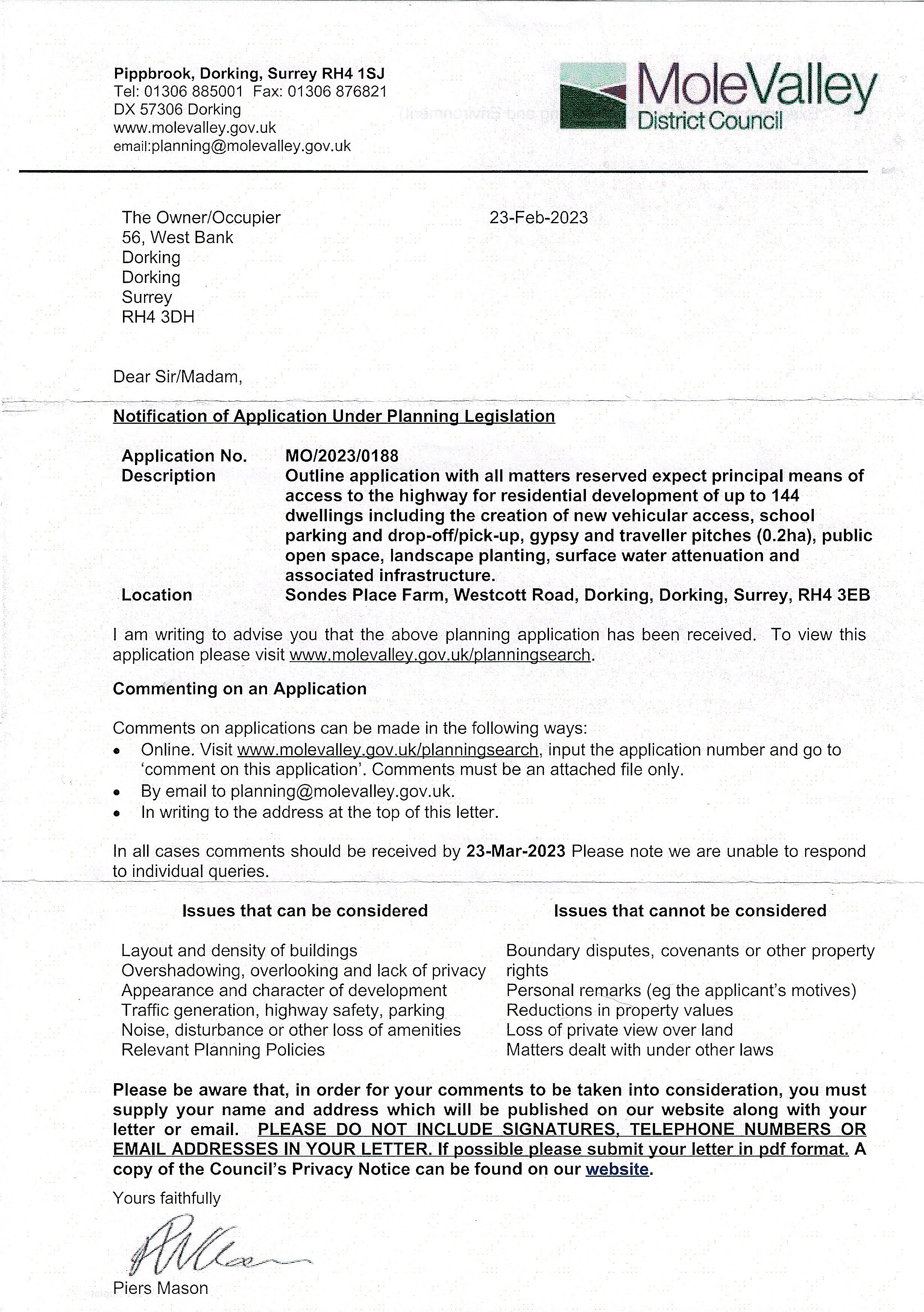 The information on the MVDC website relating to the outline planning application for the Sondes Farm fields to the south of the A25 Westcott Road is inaccurate. I spoke to Sherelle Munnis, the Planning Officer responsible for this application. There are 100 'neighbours' cited as in receipt of letters notifying them of this development, only 70 of these are valid. The remaining 30 are duplicates because the system they use at Mole Valley has recently had an update which has caused them no end of problems with regard to sending out letters to residents. I also questioned whether it was in the public interest to 'stick to the letter of the law' and only inform residents who live within 20 metres of the proposed development. Her reply was "Well where would we stop?" The residents of most of Nower Road and West Bank have not received notifications nor have the residents of Sondes Farm or Longfield Road and Westcott Road has been left out as well. She was at pains to point out that any resident of Mole Valley has a right to send in letters of objection to this proposal and they will all carry equal weight no matter where in the town they are from. Please share this post as widely as possible, this developer knows that they need to get this application decided before the introduction of new government legislation which will prevent them from building on the green belt. The link to the planning application is https://planning.agileapplications.co.uk/.../appli.../123072 but it is pretty flaky and doesn't always work.