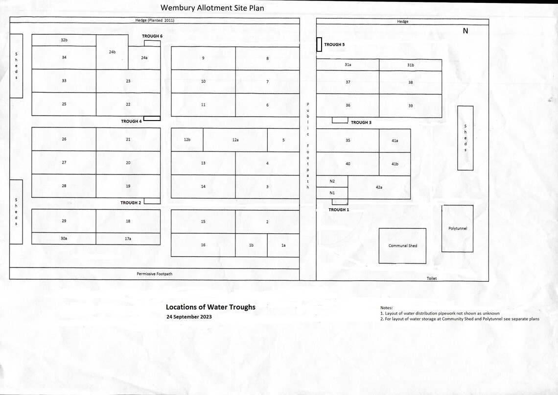 A number of dip-tanks are situated around the site. In the Winter months from October to March plot holders are encouraged to fill up their on site water supplies from these tanks. During the Summer months they are to be used only for refilling watering cans only. We harvest rainwater throughout the year and during the Summer it is very important that we conserve our stocks for the benefit of all.