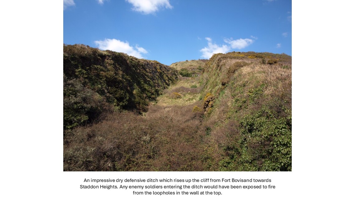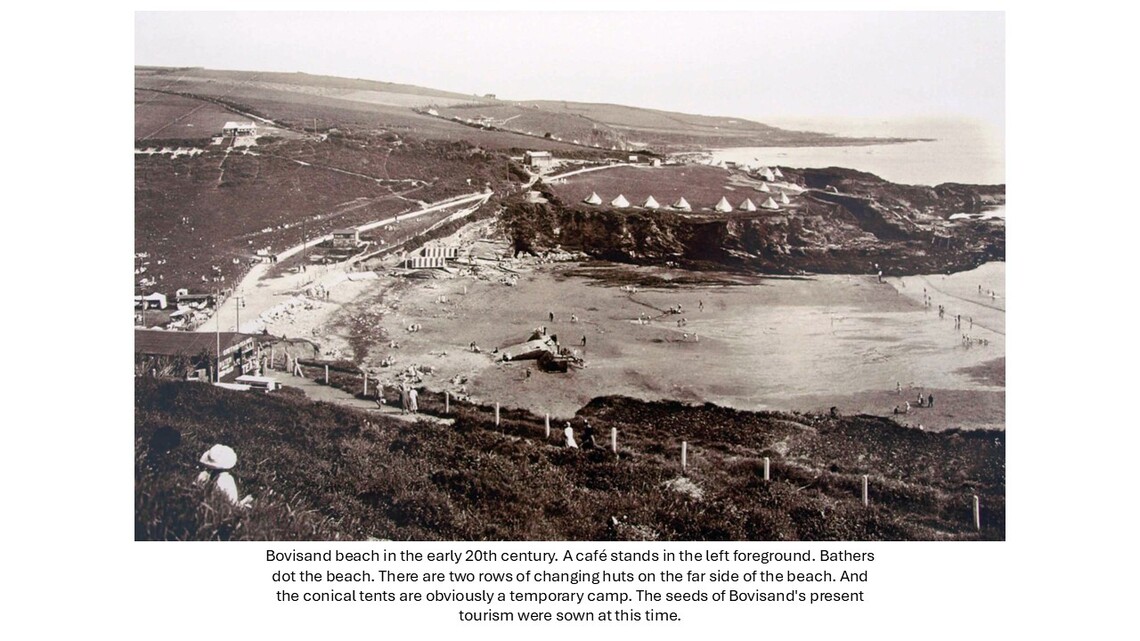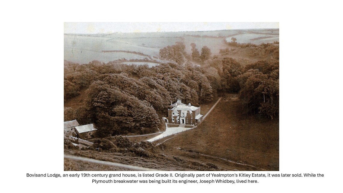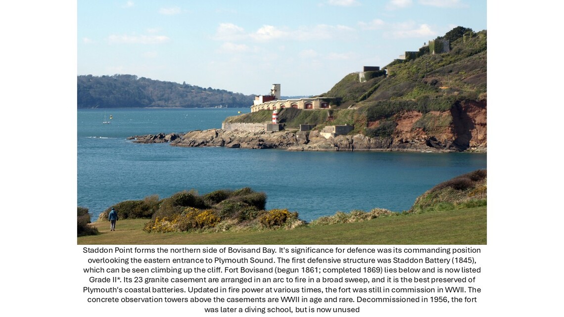 Bovisand, in north west Wembury, has had several different lives. As an outlier of the agricultural Kitley Estate in the early 19th century, its commanding views down a sweeping valley to Plymouth Sound made it an excellent site for Bovisand Lodge, one of the parish’s grand houses. With the country facing a perceived threat from France, the second half of the 19th century saw defence rise to a dominant role lasting up to WWII. But the early 20th century also witnessed a switch towards tourism taking advantage of Bovisand’s attractive beach; and it is tourism which dominates today in the form of a holiday park.