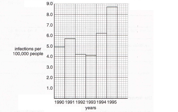 The graph shows the number of cases of food poisoning reported to doctors in England and Wales for the years 1990-95.