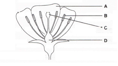 (a) Name the structures labelled A, B, C and D on the drawing.