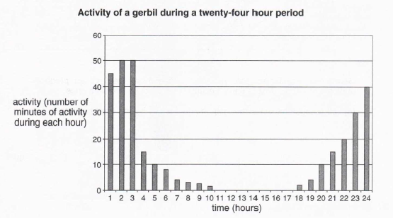 John and Marcia investigated the activity of a school gerbil by placing motionsensing electrodes in the animal's cage. The electrodes were connected to a computer which recorded when the animal was moving around the cage. The results are shown in the chart below. Time is recorded using the 24-hour clock. Midnight is 24 hours and midday is 12 hours.