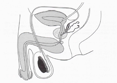 (a) Mark an X on the diagram to show the place where human sperm cells are made. (1)