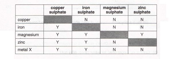 6. John decided to investigate the reactivities of various metals. He added samples of each metal to solutions in water of the sulphates of some other metals. His results are shown in the table. Y indicates that he observed a reaction, N indicates that he observed no reaction.