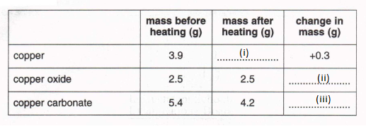 (a) Fill in the blank spaces in the table which shows the effect of heating three substances in air.