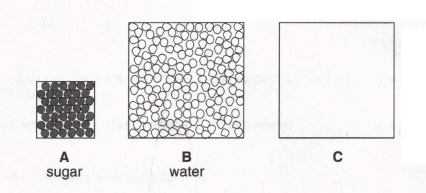 3. Look at these diagrams of the molecules in sugar and in water. In box C draw the molecules in sugar solution. (You need