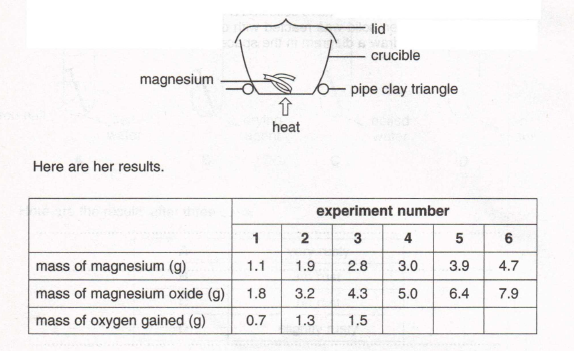 (a) Complete her results table to show the mass of oxygen gained for the last three experiments
